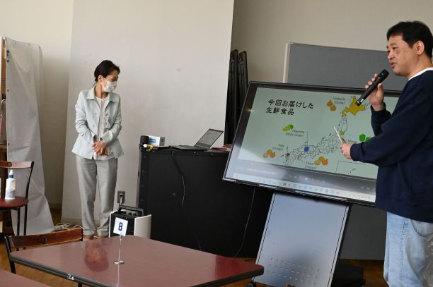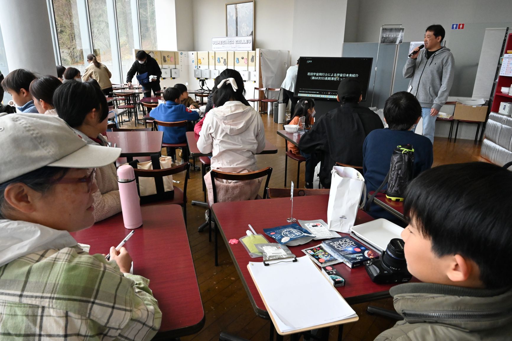 企画協力のパラボリックフライトマネジメントの貫井智之さんから宇宙船での食べ方を学んで、55組155人が体験しました。