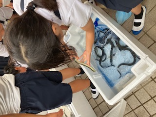 有明海に住むムツゴロウ、ワラスボ、ハゼ、ウナギなどをさわったり、観察したりします